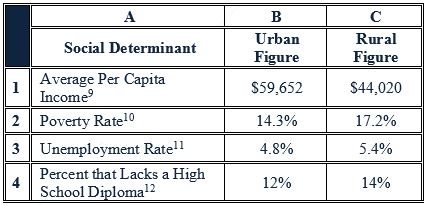 The demand for rural health services is driven by various social and health determinants, as well as by the proximity of a patient to an RHC. As set forth below in Table 1, the rate of various social determinants of health are more acute in the rural areas of the U.S. than in the urban areas, potentially indicating a less healthy population (and thus greater need for healthcare services) in rural locations.