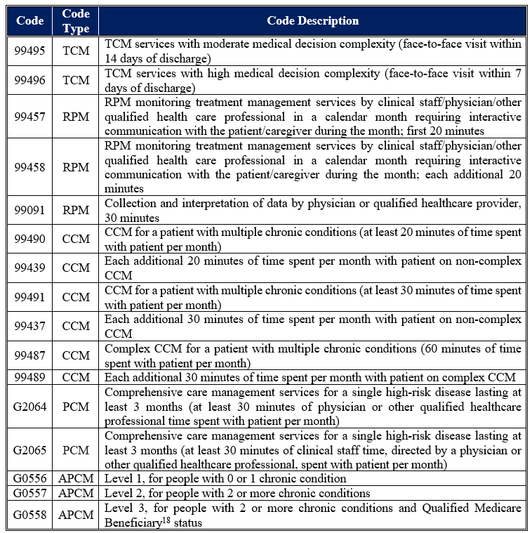a non-exhaustive list of care coordination activities reimbursed by Medicare (and their corresponding CPT codes) is set forth below in Table 1.